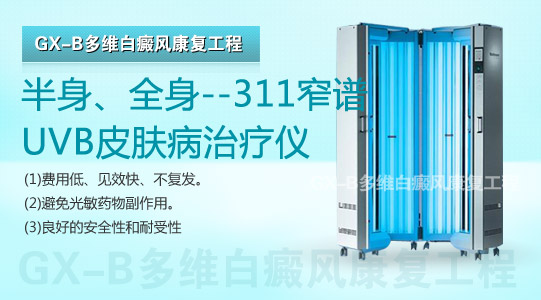 国际医学界一致认为:311窄谱uvb对银屑病、白癜风、玫瑰糠疹、带状疱疹、湿疹、皮炎、掌跖脓疱病等各类皮肤顽症见效快、总有效率高、愈后不易复发等优点。在临床实践中我们还发现,应用311窄谱UVB治疗前,如结合汽疗或药浴疗法会取得更好的治疗效果。
